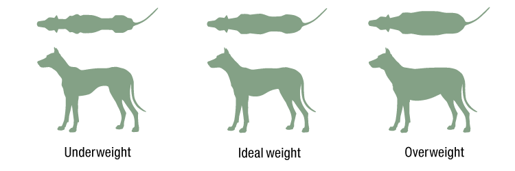 It is important to find the right measure or the optimal amount: too much energy intake can easily lead to obesity. Too little energy, on the other hand, can result in weight loss and deficiency symptoms (especially in the growth phase). Only if the feeding quantity corresponds to the actual consumption can the dog maintain its ideal weight. In the true sense of the word, the aim is not to achieve the dog’s ideal weight, but rather its ideal appearance. This is because a dog with an increased activity level will gain muscle mass and lose fat mass at the same time. Muscle, however, is heavier than fat, and so the scales would falsely indicate an increase in (excess) weight. Therefore, use sight to determine the ideal weight. Here, the so-called Body Condition Score (BCS) has been proven to work. The waist must be visible from above (behind the ribs) and the tucked-in belly line from the side. In addition, the dog should be well proportioned overall and the dorsal vertebrae should be palpable when pressed gently. In growing young animals, the BCS is most informative in conjunction with a growth curve and regular weight checks.