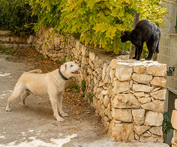 During the first encounter, the dog should be kept on a lead to avoid a possible chase. This could frighten the cat. Even if the dog is on its lead, you should still provide the cat with opportunities to retreat. A tall scratching post, a den or an open door to another room can serve this purpose.