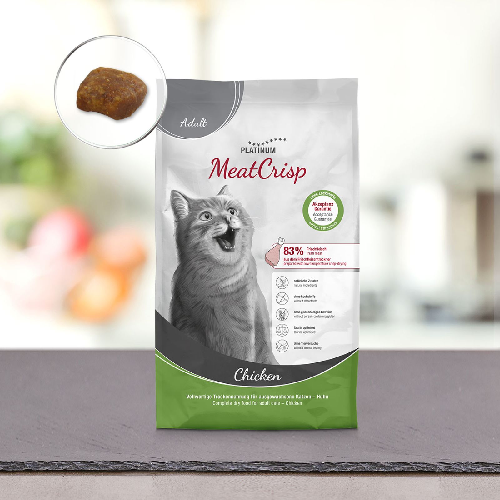 MeatCrisp 鮮肉脆是利用 Freshmeatdryer (FMD)生產的第一款健康貓糧。 MeatCrisp 鮮肉脆含有鮮肉的天然微量營養素和氨基酸,使它比大多數其他貓糧更能替代貓的天然獵物。